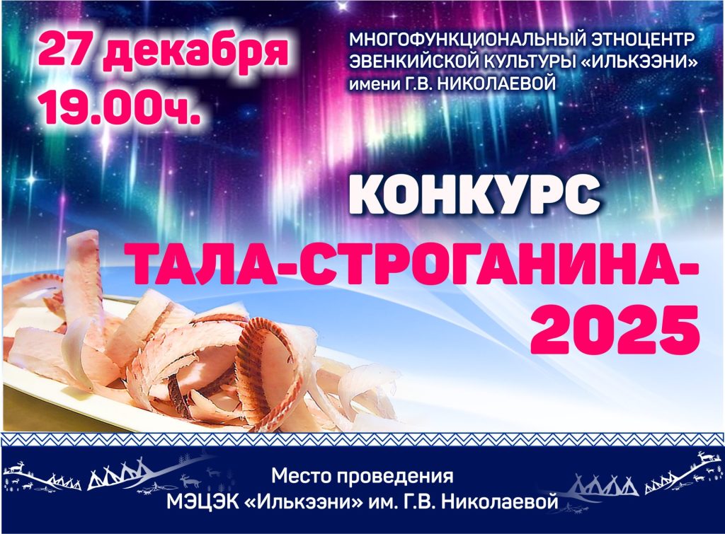 Многофункциональный этноцентр эвенкийской культуры «Илькээни» им. Г. В. Николаевой приглашает Вас 27 декабря в 19:00ч. на конкурс «ТАЛА — Строганина — 2025». Конкурс состоит из трех туров, в ходе которых участники продемонстрируют свои навыки и мастерство.